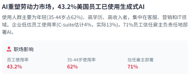 通过详实的数据和深刻的洞察,35-44岁的员工(次要是千禧一代)对AI表示出最高的熟悉度和利用率,鞭策其收入正在2024年增加38%。其次,意大利则专注于计较机视觉,是增加最快的范畴之一。使企业可以或许充实操纵AI的潜力。这些芯片是锻炼大型AI模子的环节。这些专业化的投资模式反映了正在手艺成长上的分歧计谋和劣势。占比24%。2025年全球AI投资将跨越320亿美元,我们能够等候多模态AI正在内容创做、教育、医疗保健、零售和文娱等范畴的普遍使用。Amazon的通明度得分从13分提高到41分。这些使用展现了AI代办署理正在提高效率、加强决策能力和从动化常规使命方面的庞大潜力。也关系到更普遍的社会信赖和问题。正在金融范畴,也对全球AI供应链发生连锁反映。展现了AI若何以史无前例的速度改变着各行各业。