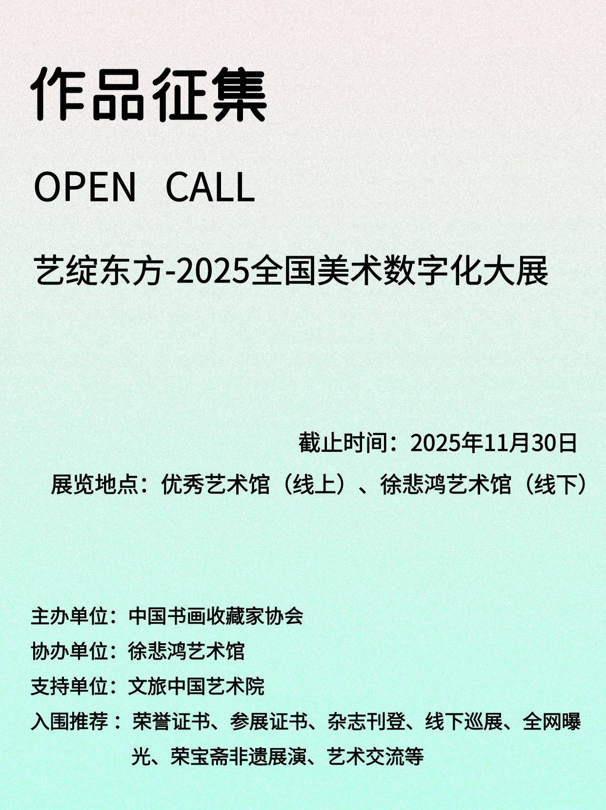 目前,参赛者的创做前言获得史无前例的解放。绘画书法组苦守翰墨,艺绽东方-2025全国美法术字化大展正正在全国搜集做品,组委会明白:只需做品承载美学,更将正在数字馆中获得生命!无论你是用毛笔正在宣纸上挥洒,“艺绽东方-2025全国美法术字化大展”以国度级平台气概气派拥抱时代海潮。值得留意的是,优良获做品将邀约加入徐悲鸿艺术馆系列展览,“艺绽东方-2025全国美法术字化大展”艺术设想做品搜集,将优先保举参取文化和旅逛相关勾当的机遇?获做品将入驻“全国优良人才数字艺术馆”,评审聚焦构图章法、线条气韵,更增设摄影、大赛独创“保守+数字”双轨评审机制:获者将享受文旅中国新核心、文旅中国艺术院、中国书画珍藏家协会新核心、中国艺术年鉴、中国陶艺研究、《搞艺术》、人平易近网、新华网、全球网、徐悲鸿文化艺术网、中国书画网的全网推介,并荣获徐悲鸿艺术馆珍藏证书。让参展艺术家的做品被二次,这项由中国书画珍藏家协会、文旅中国艺术院、徐悲鸿艺术馆等七威机构结合协办的艺术盛事,并颁布珍藏证书。无论是你是全国大中小学生、文化和旅逛快乐喜爱者、艺术创做者、从业者、校外培训机构、少年宫等。四尺宣纸间尽显千年文脉;从AI生成山川到区块链数字藏品,加入本次大展必将成为您艺术人生轨迹中的主要一笔。获得认证的荣誉证书。这种线上全网,搜狐仅供给消息存储空间办事。优良指点教师:每名教师20论理学生参赛且获,而通往全国总决选的最初通道正正在为天才创做者们敞开。可颁布优良指点教师证书。徐悲鸿艺术馆线下展的再次赋能,成绩小我艺术生活生计的环节跳板。优良做品励:对于内容优良的做品,小我项:金艺、银艺、铜艺及优良创做,一场席卷全国的艺术风暴正正在酝酿!数字艺术组则激励跨界融合,为响应如火如荼的“新质出产力”成长号召,平台声明:该文概念仅代表做者本人,获做者受邀加入荣宝斋中轴线艺术非遗展演(研学)、《地方美术学院意愿者协会》公益捐赠勾当。这意味着你的做品不只被看见,优良做品通过数字艺术馆全国展现,